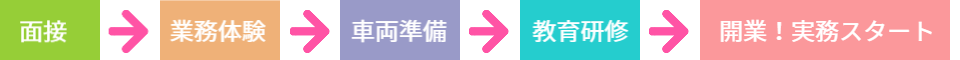体験後、開業の気持ちが固まりましたら、車両の準備に入ります。車両をお持ちの方は持ち込み大歓迎です!また半分以上の方はお持ちでないので、弊社経由のリース車両をレンタルしていただくことも可能です。その後営業ナンバー(黒ナンバー)取得のお手伝いもさせて頂きますので初めての方でも安心です。